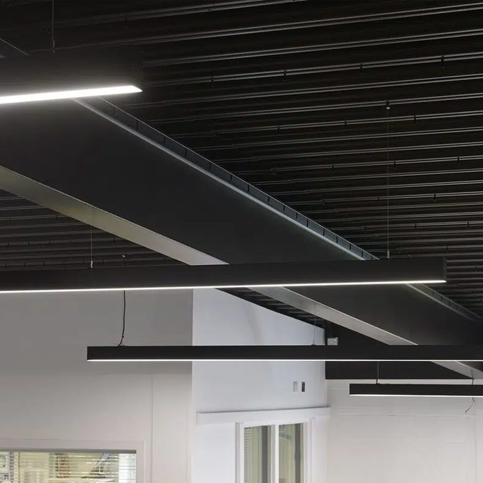 Low glare lighting in the form of the M-Line 54 low glare surface mounted or suspended linear LED can help contribute towards UGR>19 compliant workspaces with this specialised low glare microprismatic diffuser manufactured from polycarbonate. The M-Line 54 is supplied as a suspended low glare light fitting but the profile can also be utilised for surface mounting. This is achieved by directly fixing through the rear of the profile. Suspension is made simple using a single-point ceiling bracket with a 2m adjustable stainless steel wire system.