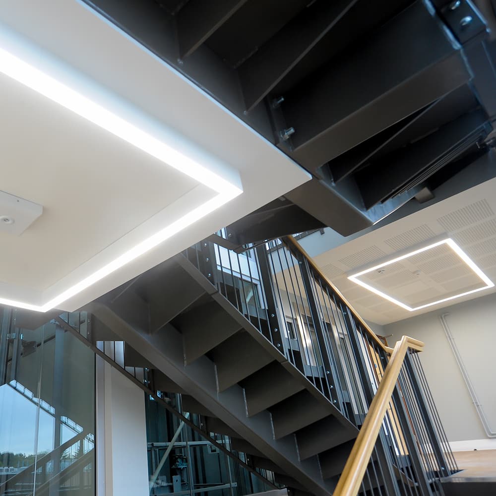 For clean, continuous runs of light that fully illuminate office and commercial spaces, our M-Line surface lighting systems are available in standard lengths up to 2824mm. Custom continuous systems can be ordered, and bespoke geometric-shaped feature lights with fully illuminated corners can be created upon request.